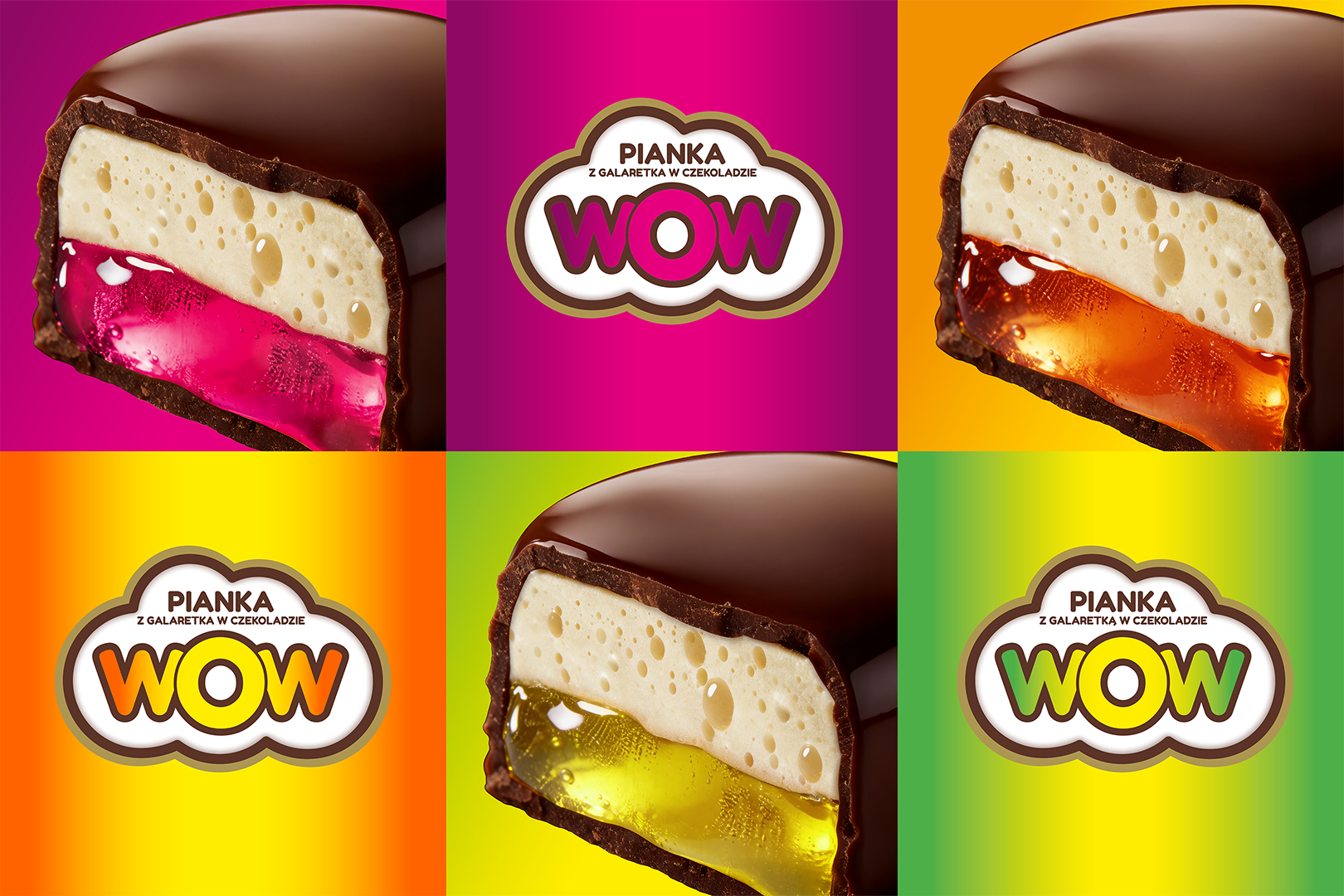 System trzech wyrazistych wariantów kolorystycznych: magenta (cherry), limonkowy zielony (cytryna), głęboki pomarańcz (pomarańcza). Przekrój pianki z widoczną galaretką jako główna ikona — jedna wizja komunikuje skład, smak i teksturę. Acid colours jako świadomy kontrast wobec kremowej estetyki Wedel.